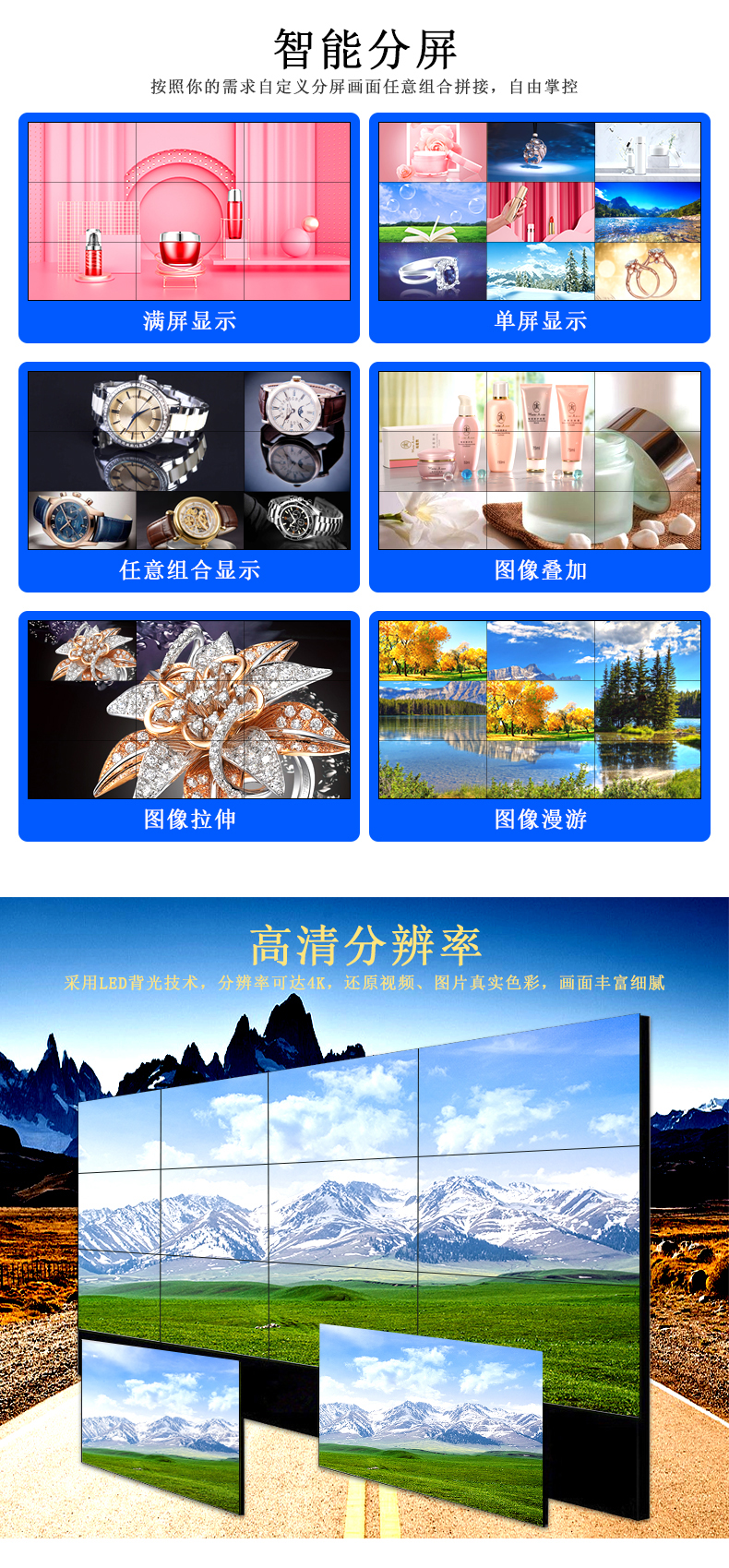 內(nèi)置數(shù)字圖形處理盒,整屏可以實現(xiàn)單屏顯示,整屏顯示或任意組合畫面顯示等功能 |